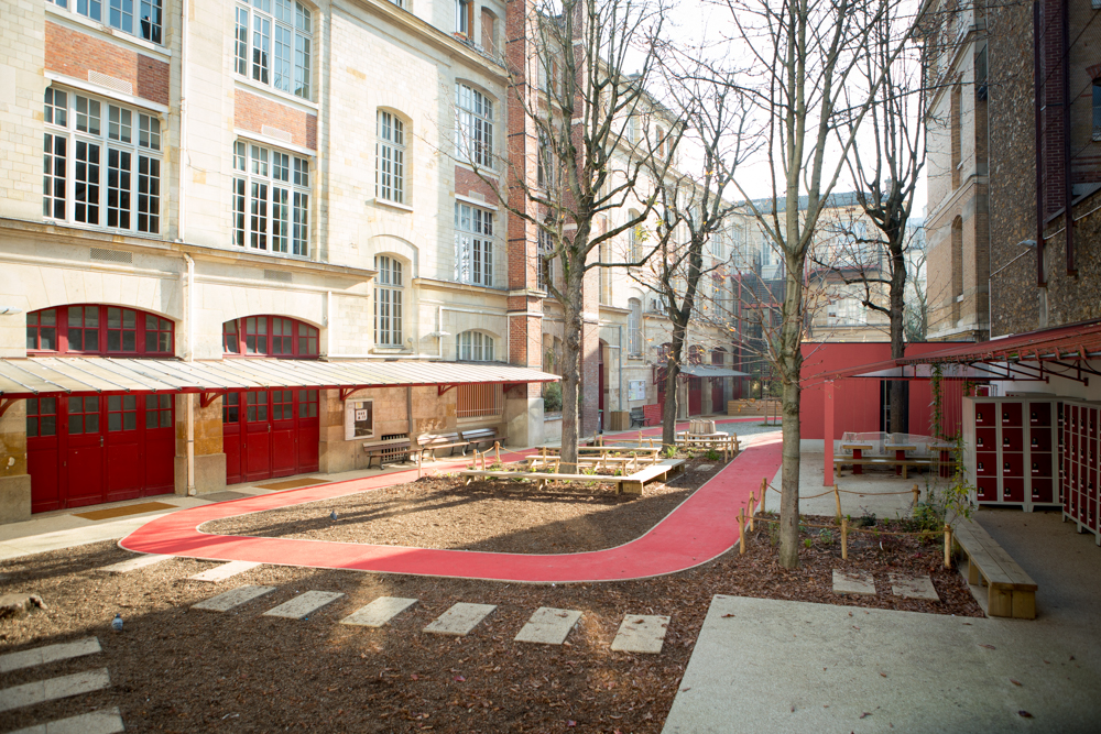 Une grande piste de laser run de 100 m parcourt la cour tel un ruban rouge autour des arbres. Quelques pavés de béton désactivé permettent de pratiquer ce sport dans la cour. Des tables avec un plateau d’échecs sont installées sous la nouvelle verrière. Dans les deux recoins ensoleillés de la cour, des grands emmarchements sur-mesure ont pris place afin de proposer des assises mais aussi un espace de détente, lecture ou jeu de motricité. L’un proche de la classe ULIS permet de faire classe dehors à l’ombre du nouveau fruitier et l’autre permet de rejoindre la rue voisine et d’accéder à l’annexe du collège.