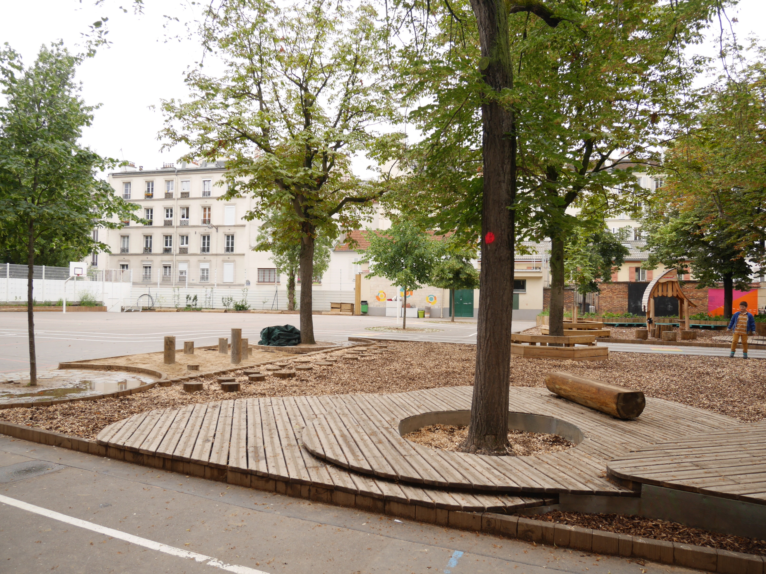 Le projet a conservé l’asphalte existant en bon état et s’est attaché à désimperméabiliser et végétaliser une partie de la cour, principalement les pieds d’arbres. Des plateformes en bois ont été créées afin d’offrir des espaces privilégiés aux enfants et de grandes jardinières en pleine terre sont venues habiller les pieds d’arbres et les pieds de murs. Plusieurs assises, rondins et cabanes offrent aux enfants des espaces de jeux et de calme. La zone sportive a aussi été améliorée grâce à un marquage au sol formant un circuit pour les vélos.