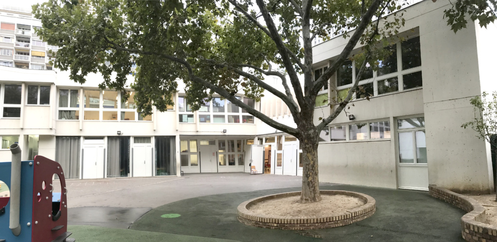 – Créer une ambiance naturelle et végétalisée forte en profitant des nombreux arbres existants : le sol souple existant a été démoli et le pied des arbres a été désimperméabilisé pour permettre l’infiltration des eaux pluviales. Dans une clairière centrale en copeaux, sous le grand platane, une structure de jeux en bois a été installée. Son large toboggan et ses escaliers facilitent l’accès à tous les enfants. Des massifs plantés contre la clôture opaque de la cour créent un horizon végétal qui évolue au fil des saisons. Un amphithéâtre en rondins de bois offre la possibilité de regrouper les enfants à l’ombre des arbres.